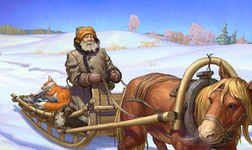 – Вот будет подарок жене! – обрадовался дед, поднял лисичку, положил на воз, а сам пошел впереди. А лисичка-сестричка улучила удобную минуту и стала потихоньку выбрасывать из кадушки рыбку за рыбкой, рыбку за рыбкой, выбросала всю рыбу и сама незаметно спрыгнула с саней.