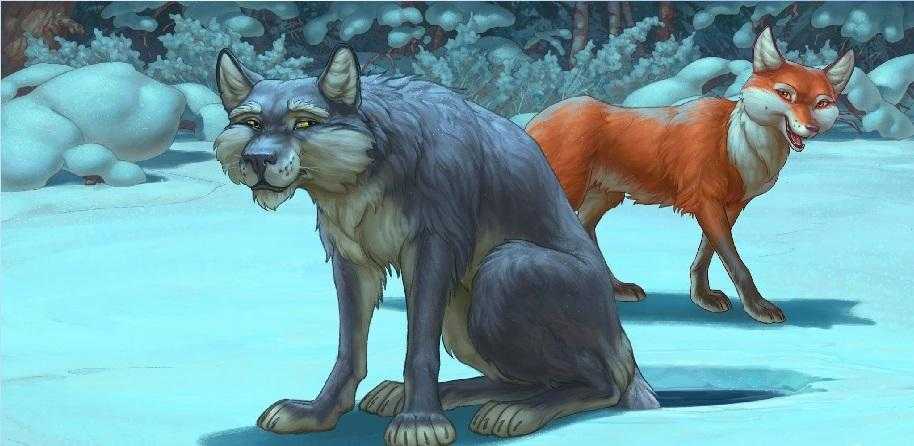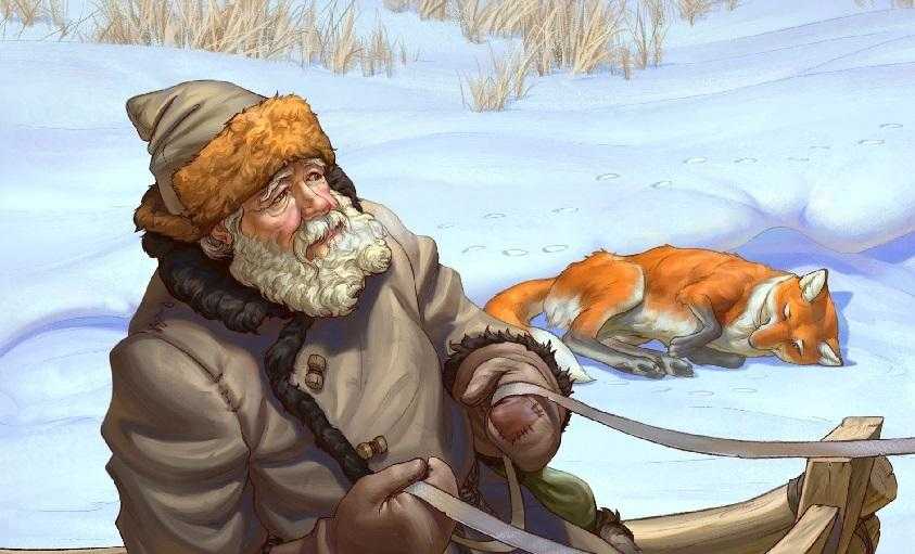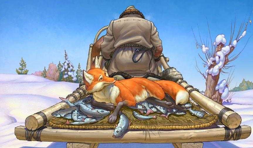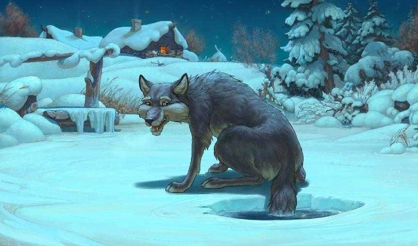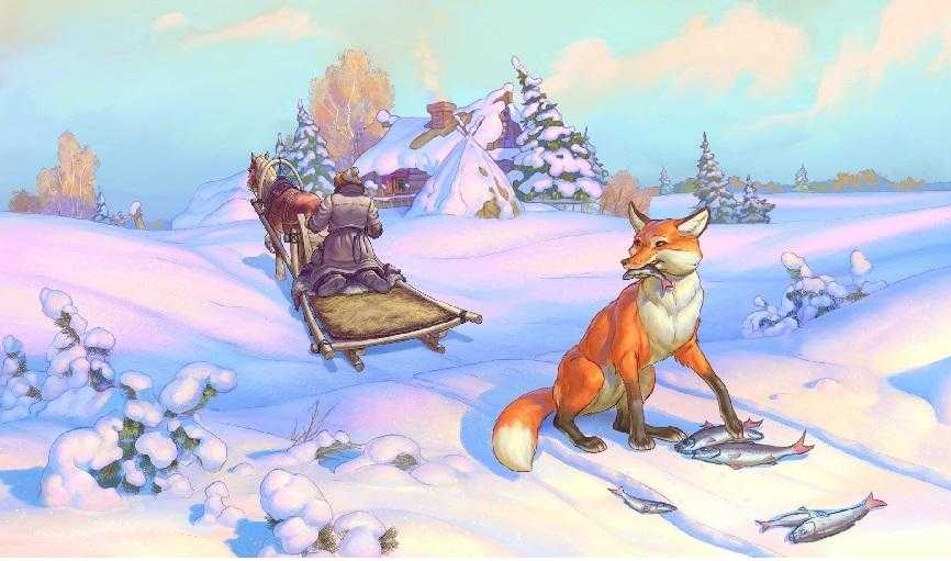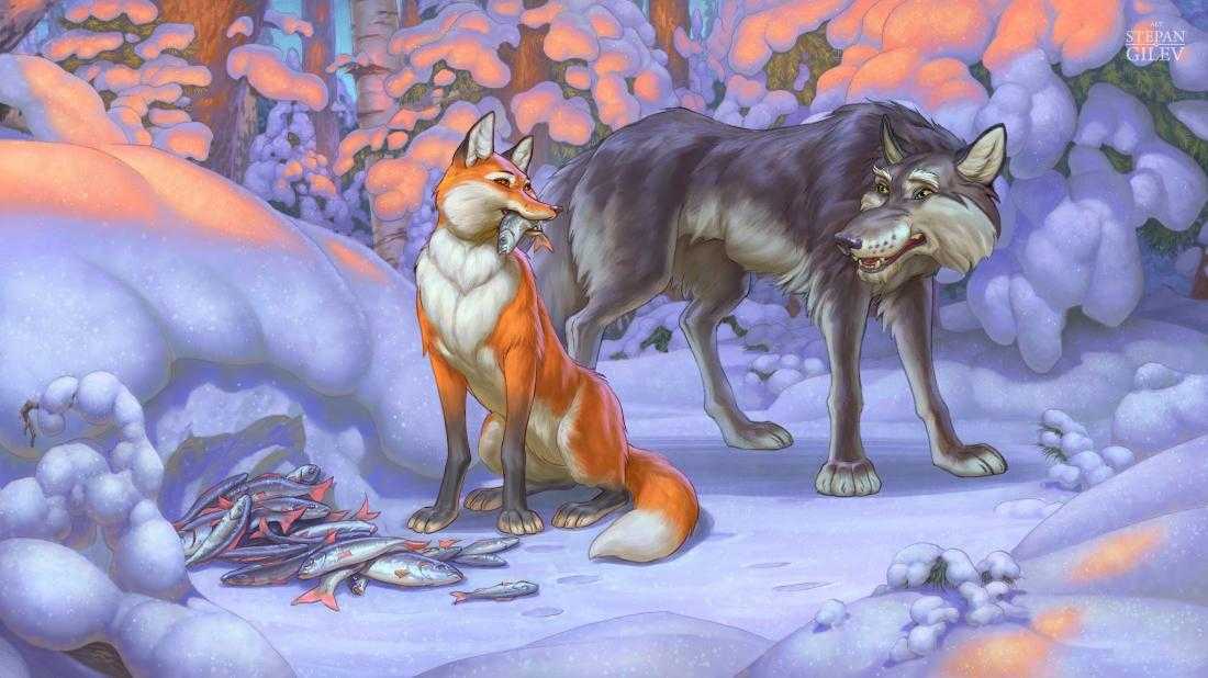 Сказка «Лисичка-сестричка и волк» о хитрой лисе, которая сначала притворилась мертвой и съела всю рыбу на санях у деда, а потом подговорила волка опустить в прорубь хвост, чтоб рыбы наловить.