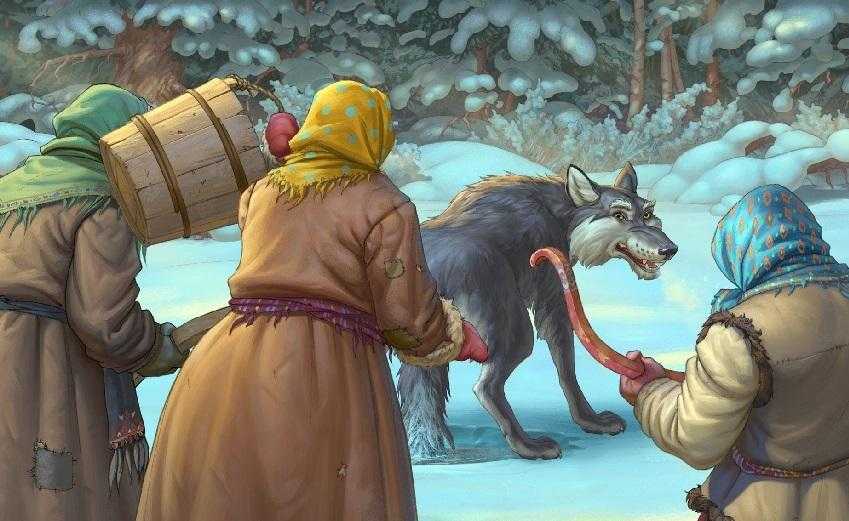 Долго сидел волк у проруби. Захотел встать, но хвост его приморозило. А тут бабы пришли за водицей. Увидели волка и стали его бить ведрами. Оторвал волк себе хвост и убежал, пообещав отплатить лисице.