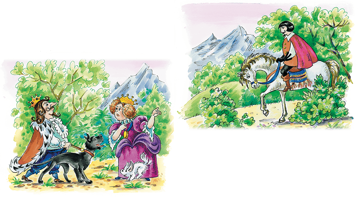 Случилось так, что неподалёку от Короля и Королевы проезжал всадник. Это был жених в красном камзоле. Услышав последние слова Короля, он вдруг пришпорил коня и помчался в другую сторону.