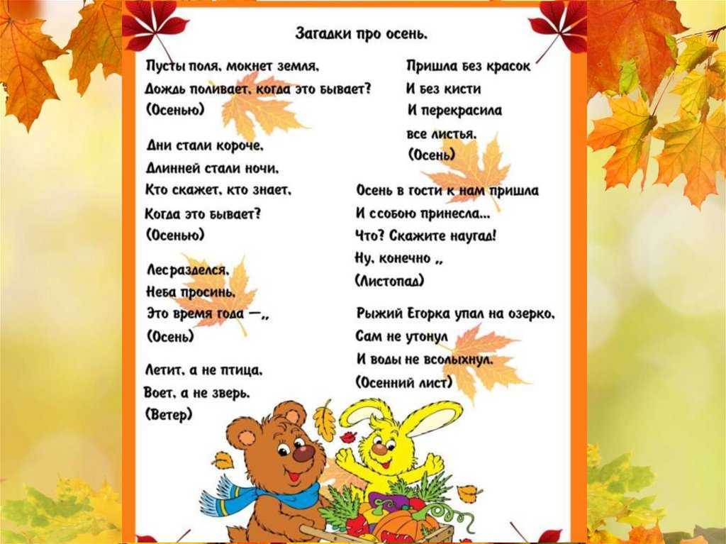 С детьми дошкольного возраста лучше сначала почитать стихи, короткие рассказы об осени и изменениях природы, понаблюдать за прородными явлениями на прогулке (обратить внимание на частые дожди, смену окраски у белок в парках, изменение листвы на деревьях и т.д.), а уже потом переходить к загадкам