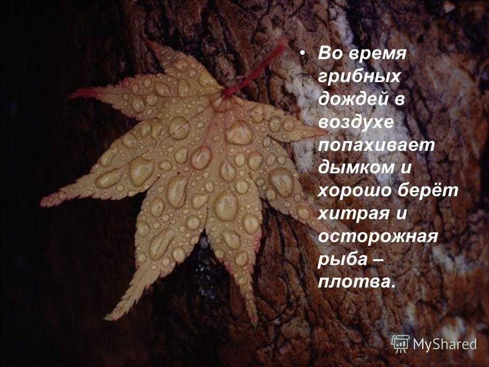 Во время грибных дождей в воздухе попахивает дымком и хорошо берёт хитрая и осторожная рыба – плотва.