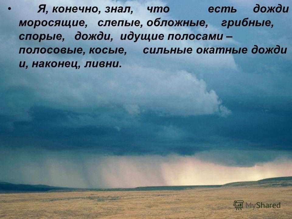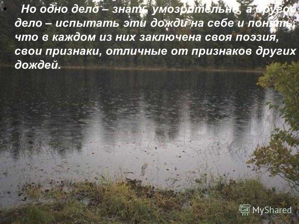 Но одно дело – знать умозрительно, а другое дело – испытать эти дожди на себе и понять, что в каждом из них заключена своя поэзия, свои признаки, отличные от признаков других дождей.