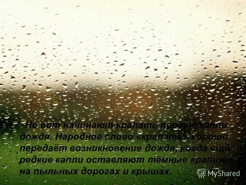 Но вот начинают крапать первые капли дождя. Народное слово «крапать» хорошо передаёт возникновение дождя, когда ещё редкие капли оставляют тёмные крапинки на пыльных дорогах и крышах.