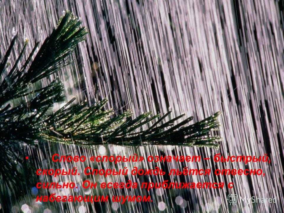 Слово «спорый» означает – быстрый, скорый. Спорый дождь льётся отвесно, сильно. Он всегда приближается с набегающим шумом.