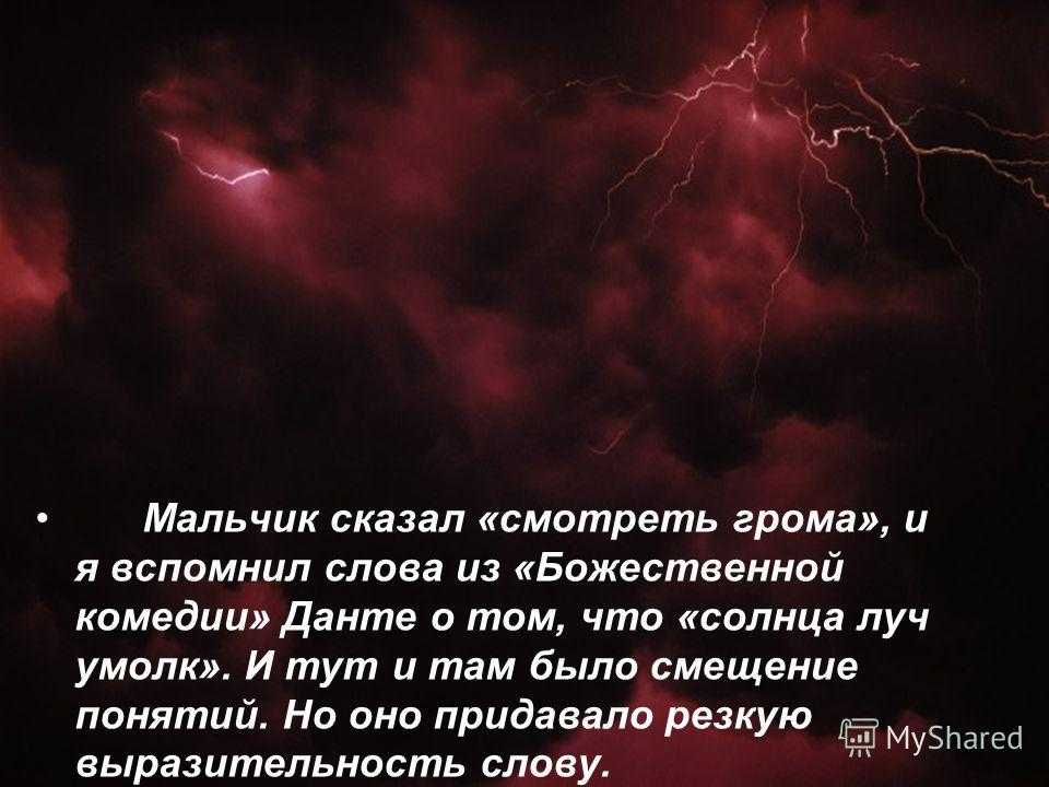 Мальчик сказал «смотреть грома», и я вспомнил слова из «Божественной комедии» Данте о том, что «солнца луч умолк». И тут и там было смещение понятий. Но оно придавало резкую выразительность слову.