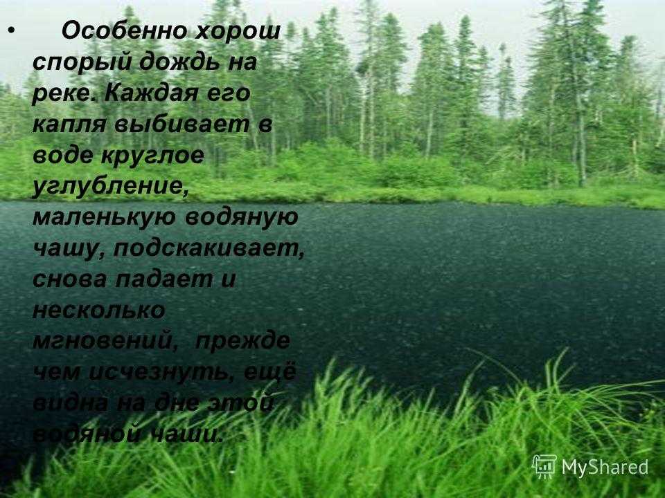 Особенно хорош спорый дождь на реке. Каждая его капля выбивает в воде круглое углубление, маленькую водяную чашу, подскакивает, снова падает и несколько мгновений, прежде чем исчезнуть, ещё видна на дне этой водяной чаши.