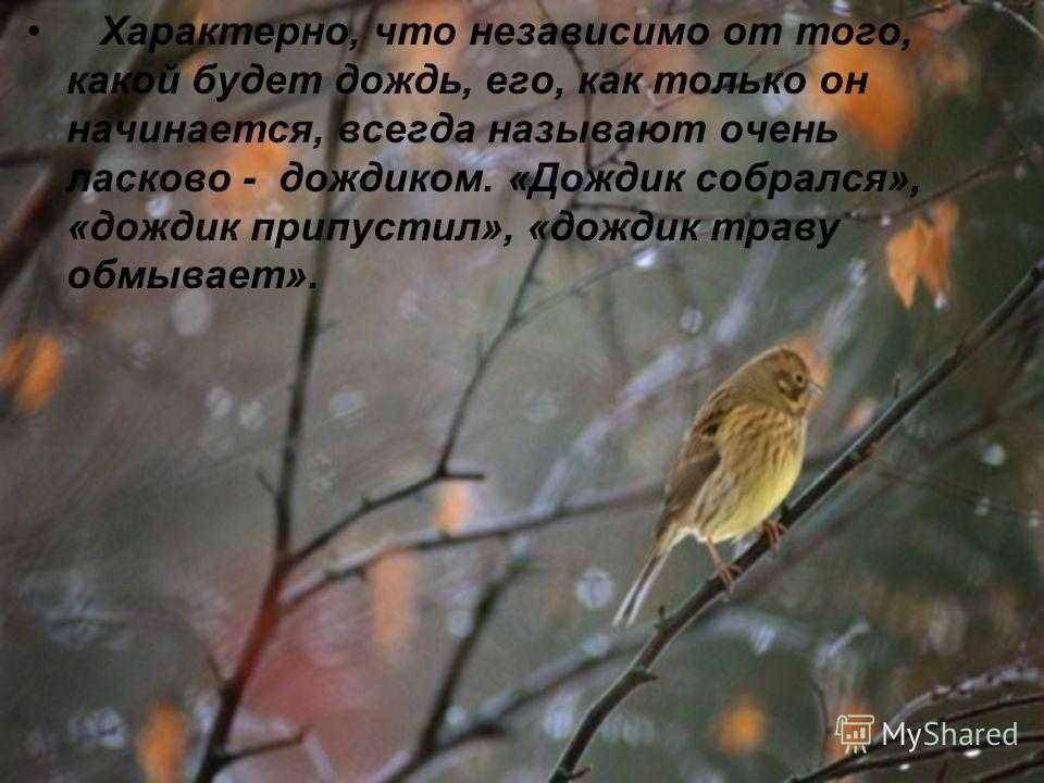 Характерно, что независимо от того, какой будет дождь, его, как только он начинается, всегда называют очень ласково — дождиком. «Дождик собрался», «дождик припустил», «дождик траву обмывает».