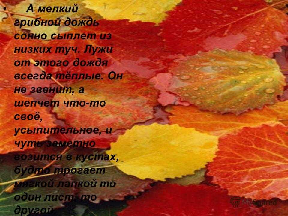 А мелкий грибной дождь сонно сыплет из низких туч. Лужи от этого дождя всегда тёплые. Он не звенит, а шепчет что-то своё, усыпительное, и чуть заметно возится в кустах, будто трогает мягкой лапкой то один лист, то другой.